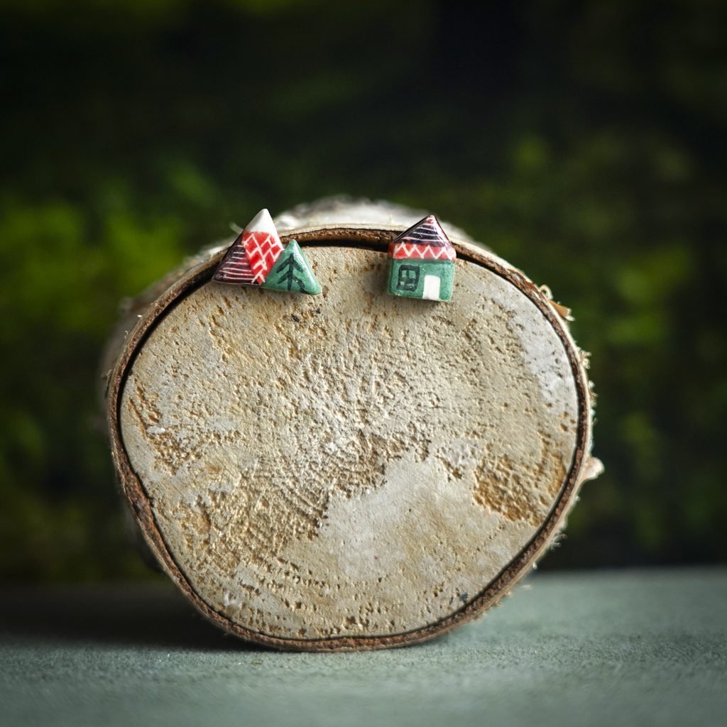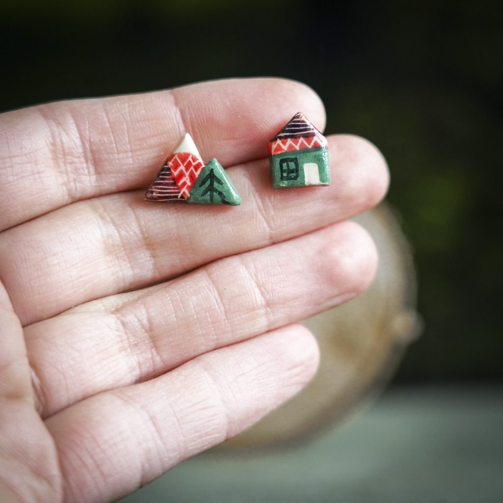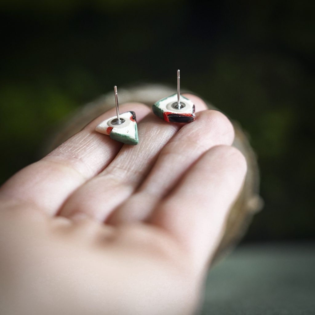 Papuošalai pagaminti iš keramikos. Iš balto molio nulipdytos formos išdegamos 1000 laipsnių temperatūroje, tada išpaišomos rankomis, padengiamos bespalve glazūra ir išdegamos antrąkart. Auskarų adatėlės pagamintos iš nerūdijančio plieno.