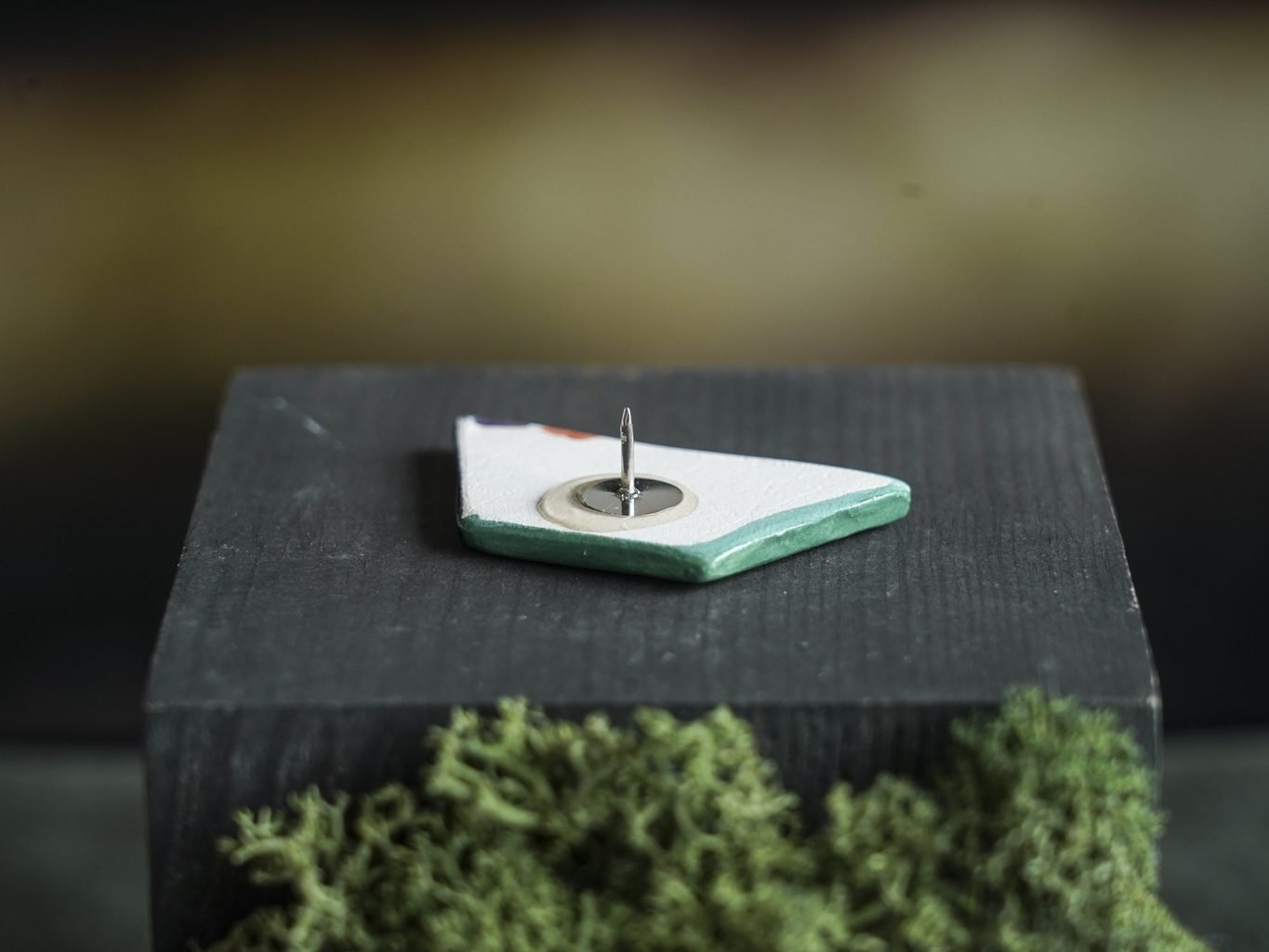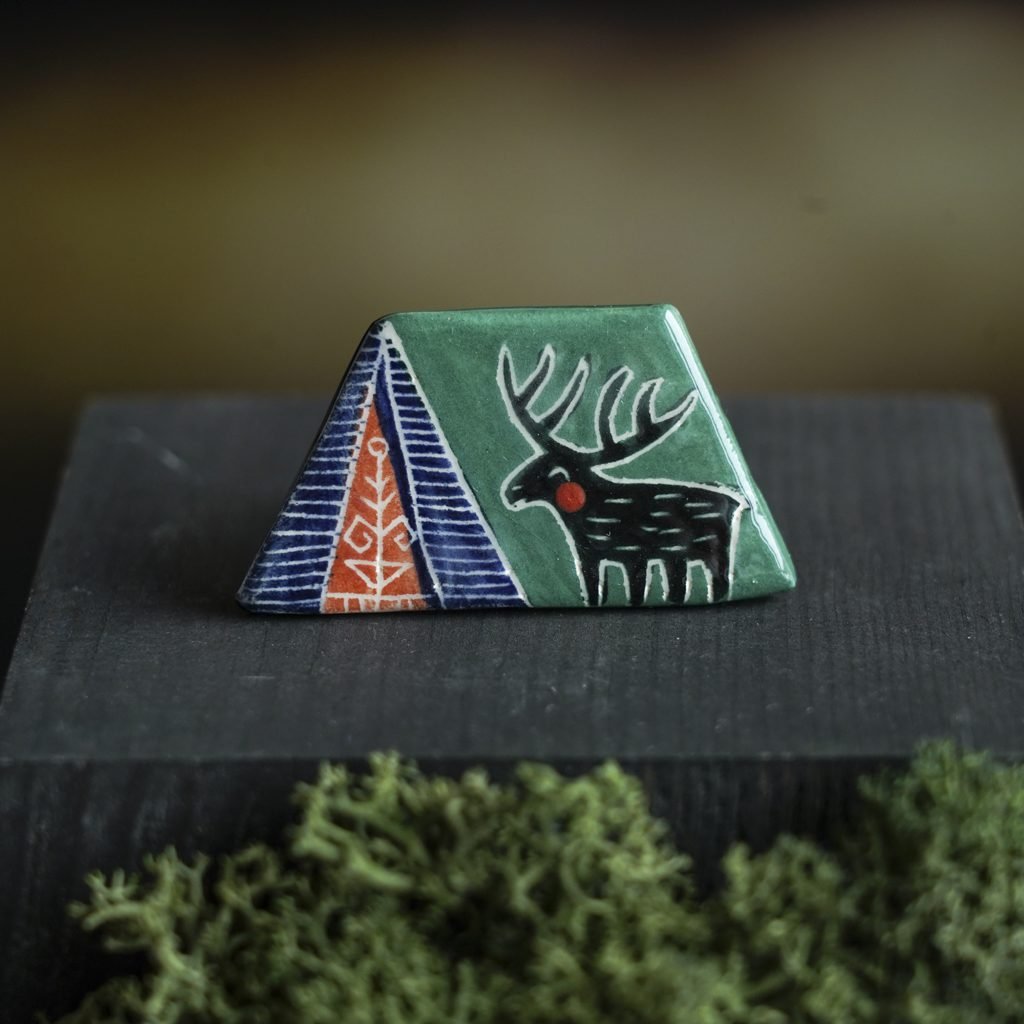 Papuošalai pagaminti iš keramikos. Iš balto molio nulipdytos formos išdegamos 1000 laipsnių temperatūroje, tada išpaišomos rankomis, padengiamos bespalve glazūra ir išdegamos antrąkart. Metalinė ženkliuko adatėlė pagaminta iš nerūdijančio plieno, kitoje pusėje užspaudžiama tvirta kietos gumos detale.