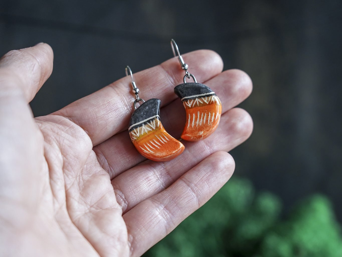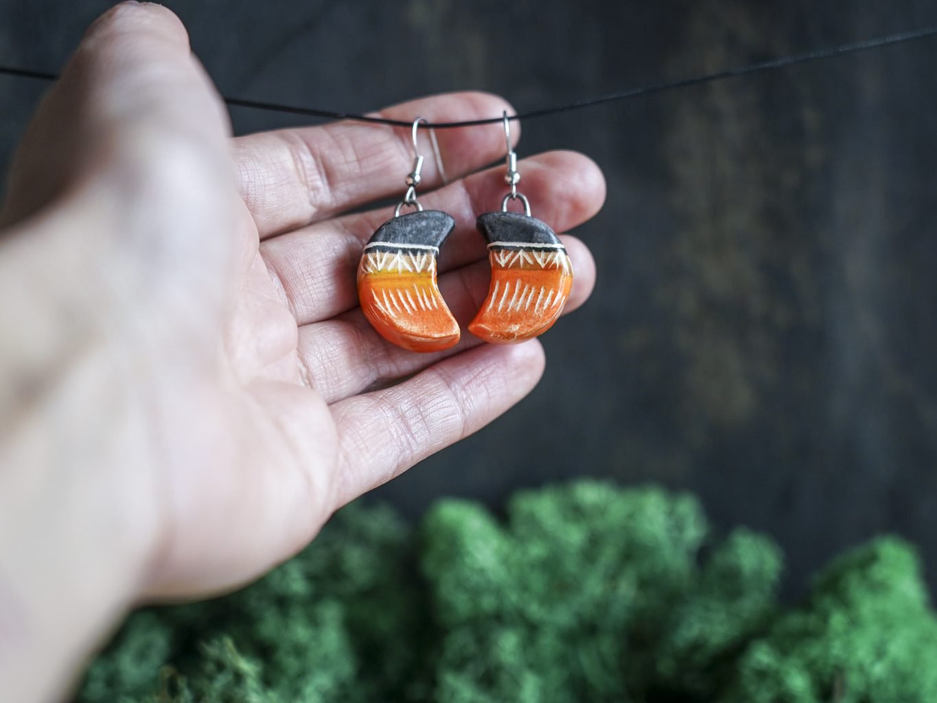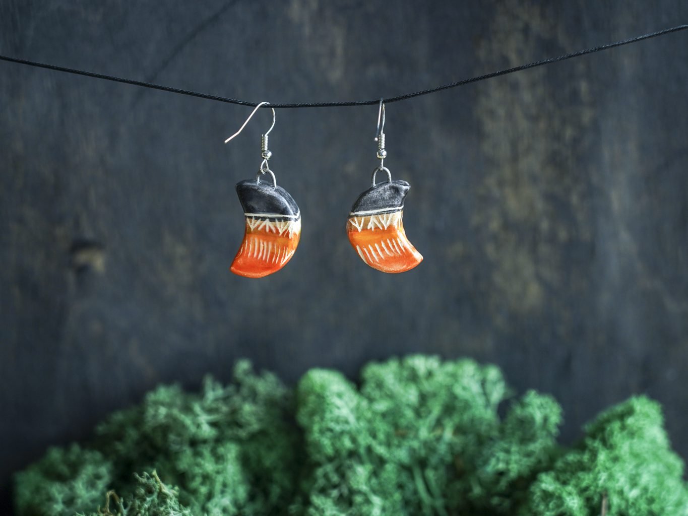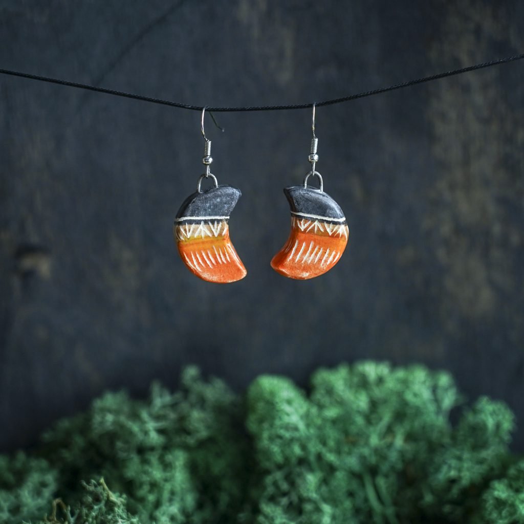 Papuošalai pagaminti iš keramikos. Iš molio nulipdytos formos išdegamos 1000 laipsnių temperatūroje, tada išpaišomos rankomis, padengiamos bespalve glazūra ir išdegamos antrąkart. Auskarų kabliukai pagaminti iš nerūdijančio plieno.
