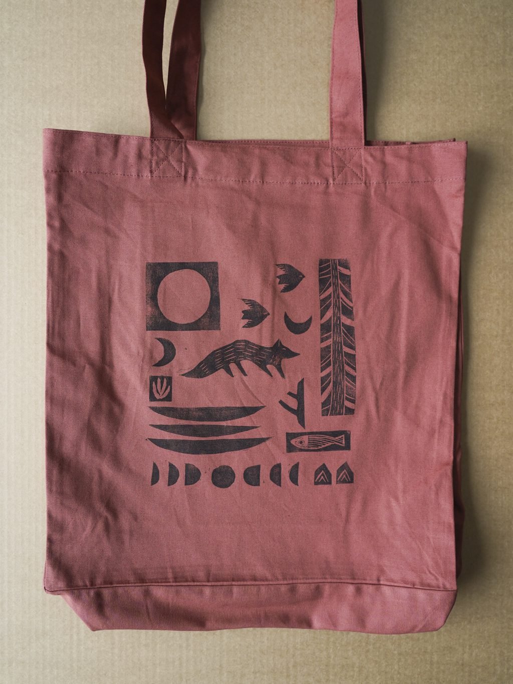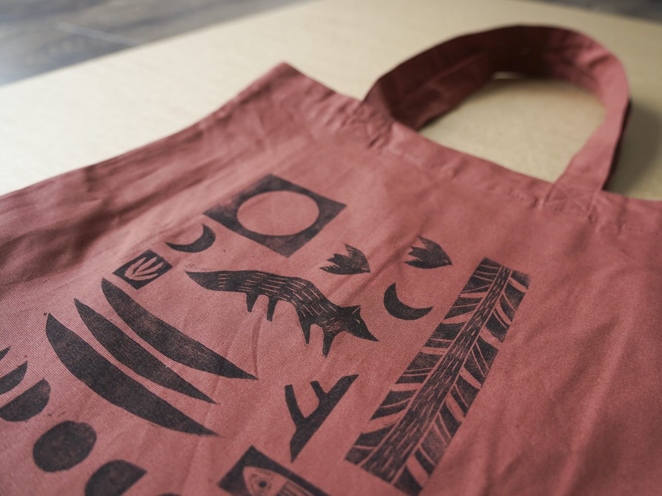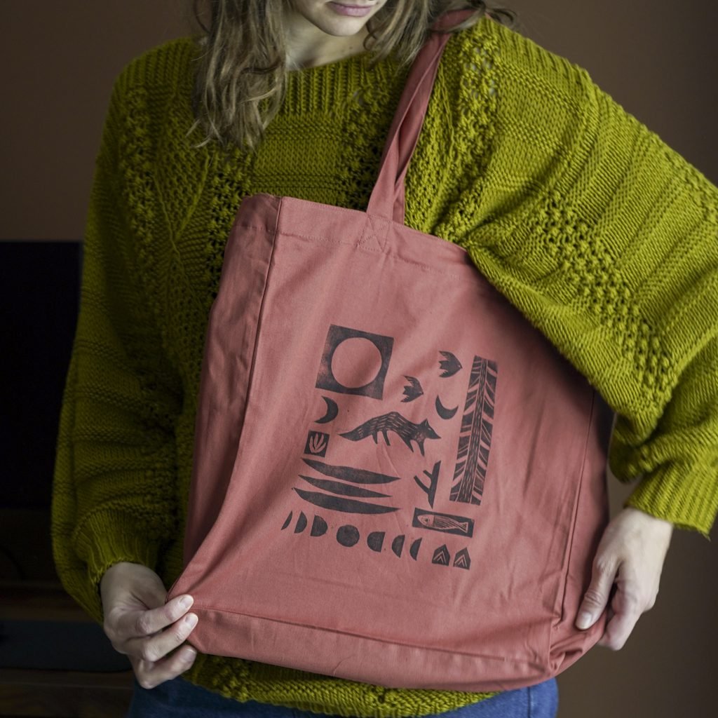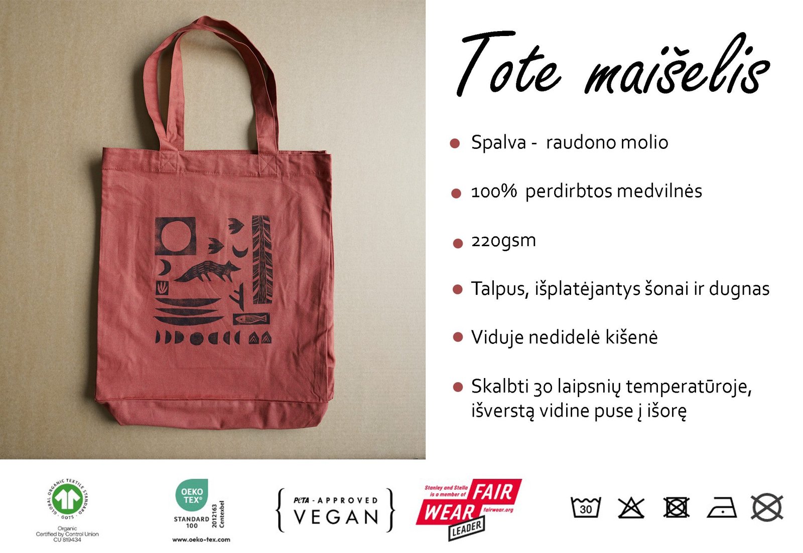 Ši tekstilės dekoro kolekcija gimė iš senos meilės terracotta(raudonojo molio) spalvai ir naujos meilės – lino raižinio spaudai. Medvilnės Tote maišelius dekoruoju savo rankomis sukurtais lino raižinio antspaudais. Piešinys gimsta pamažu kaip mozaika sukurtus žvėrelių ir gamtos motyvų spaudus dėliojant ir komponuojant. Kiekviena formelė atspaudžiama atskirai, todėl kiekvieni maišeliai visuomet vos kitokie, jaučiamas rankų prisilietimas.