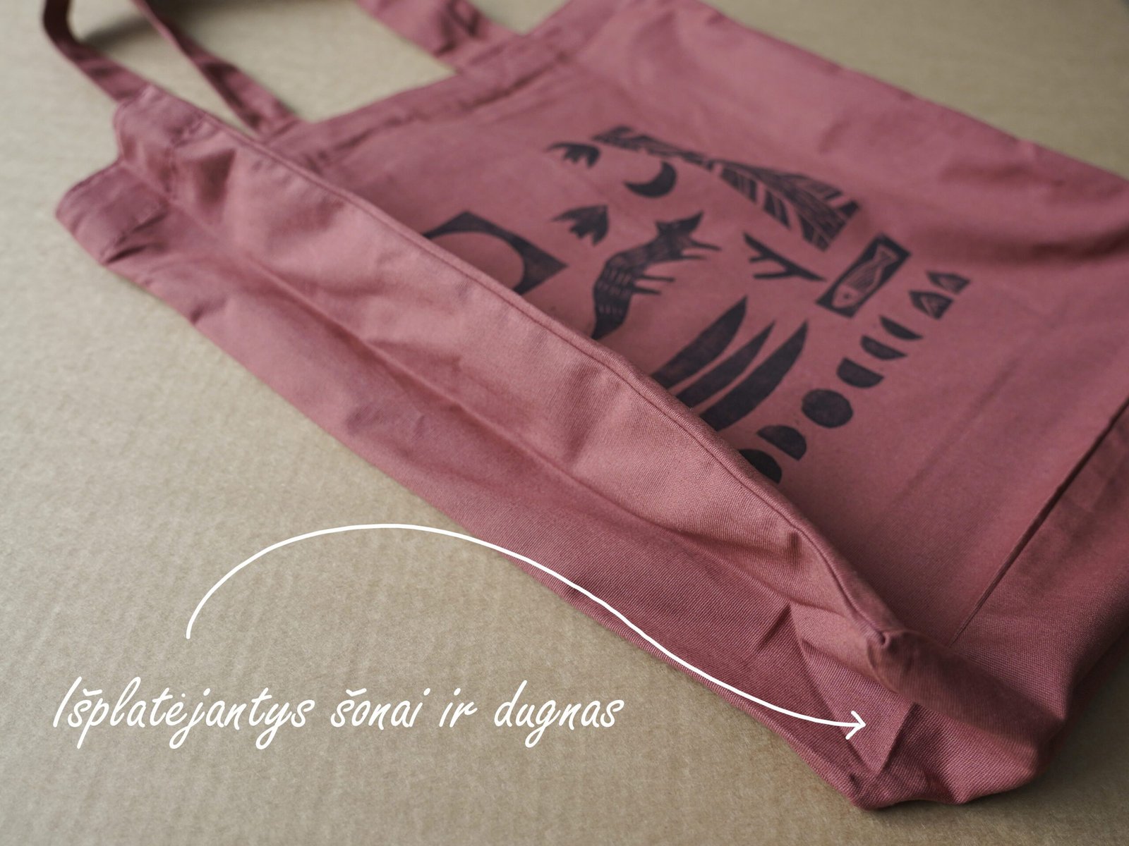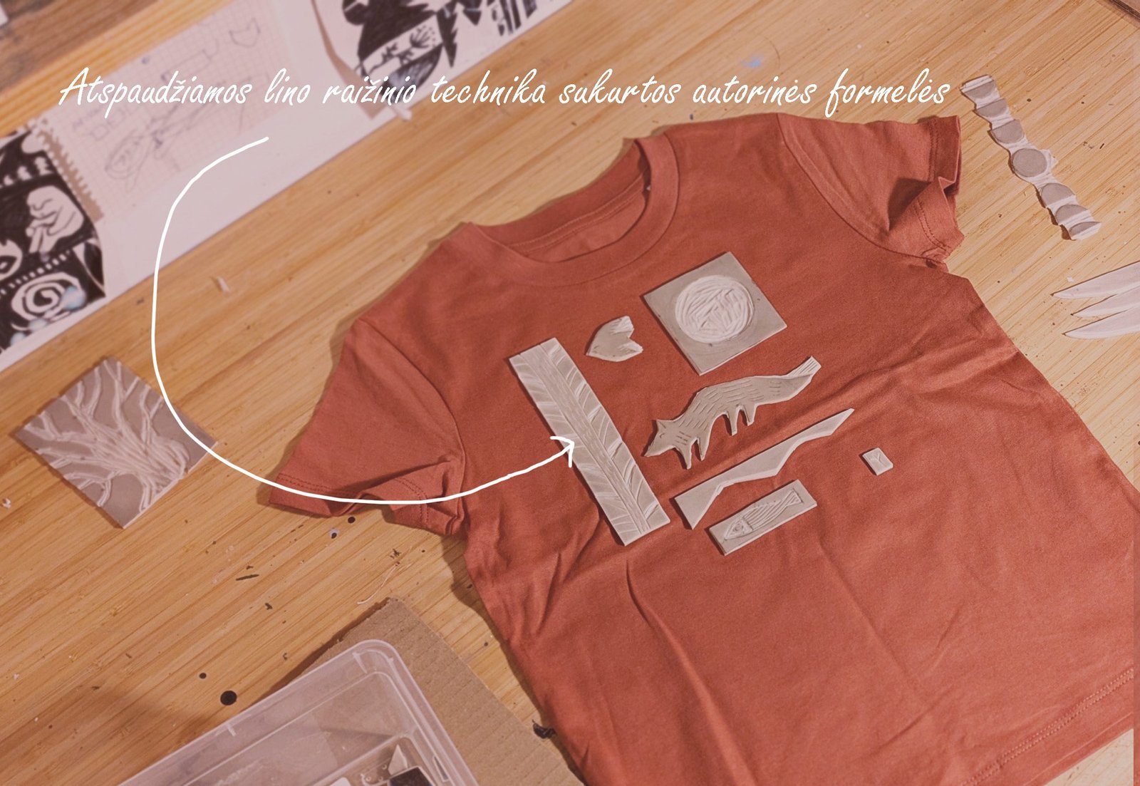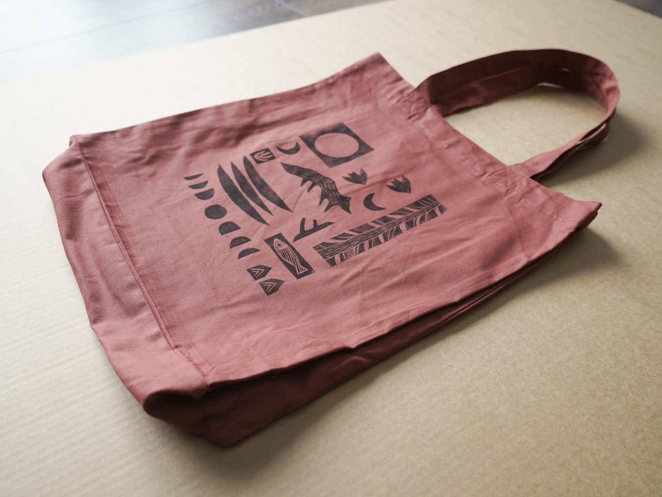 Ši tekstilės dekoro kolekcija gimė iš senos meilės terracotta(raudonojo molio) spalvai ir naujos meilės – lino raižinio spaudai. Medvilnės Tote maišelius dekoruoju savo rankomis sukurtais lino raižinio antspaudais. Piešinys gimsta pamažu kaip mozaika sukurtus žvėrelių ir gamtos motyvų spaudus dėliojant ir komponuojant. Kiekviena formelė atspaudžiama atskirai, todėl kiekvieni maišeliai visuomet vos kitokie, jaučiamas rankų prisilietimas.