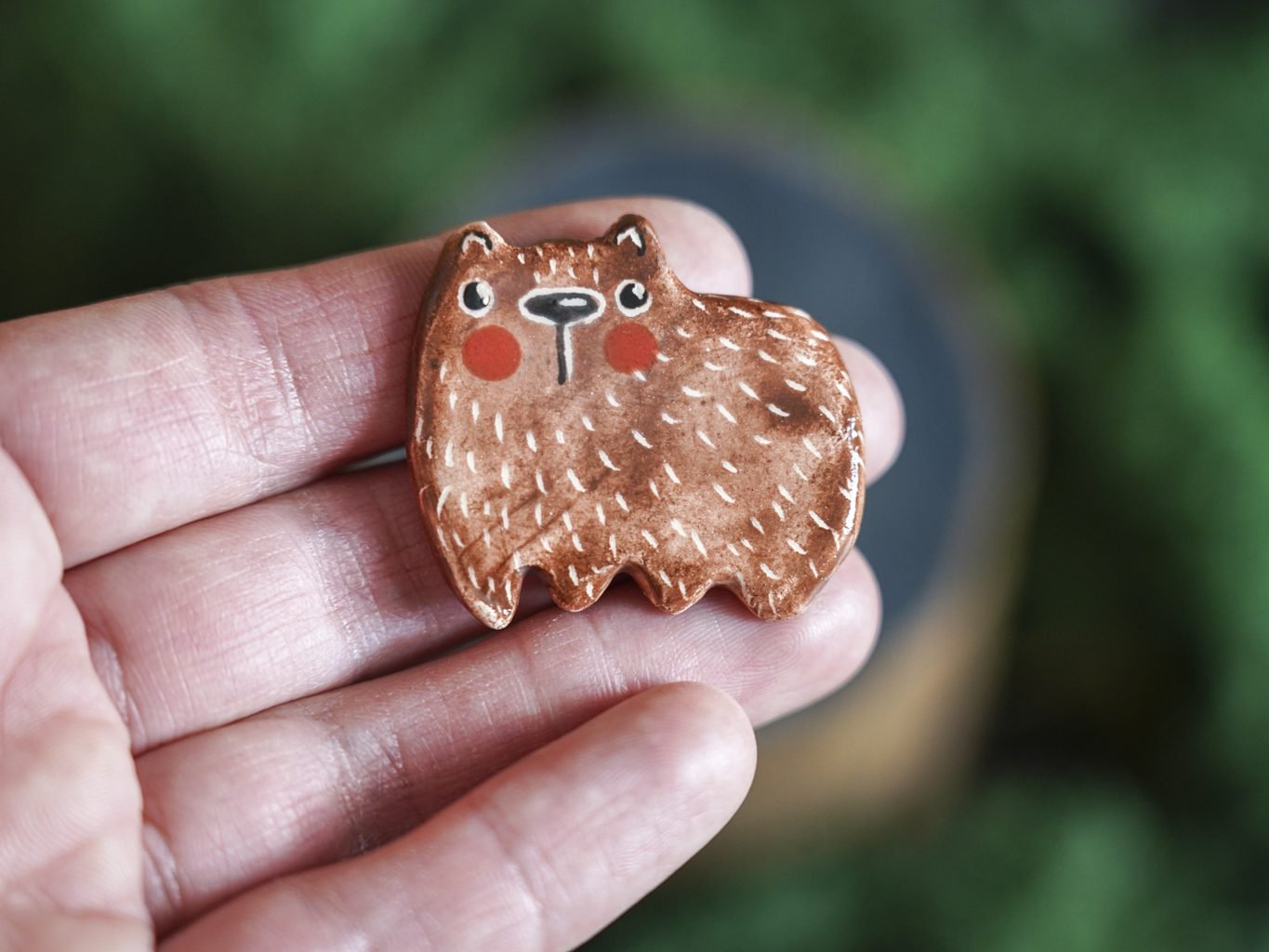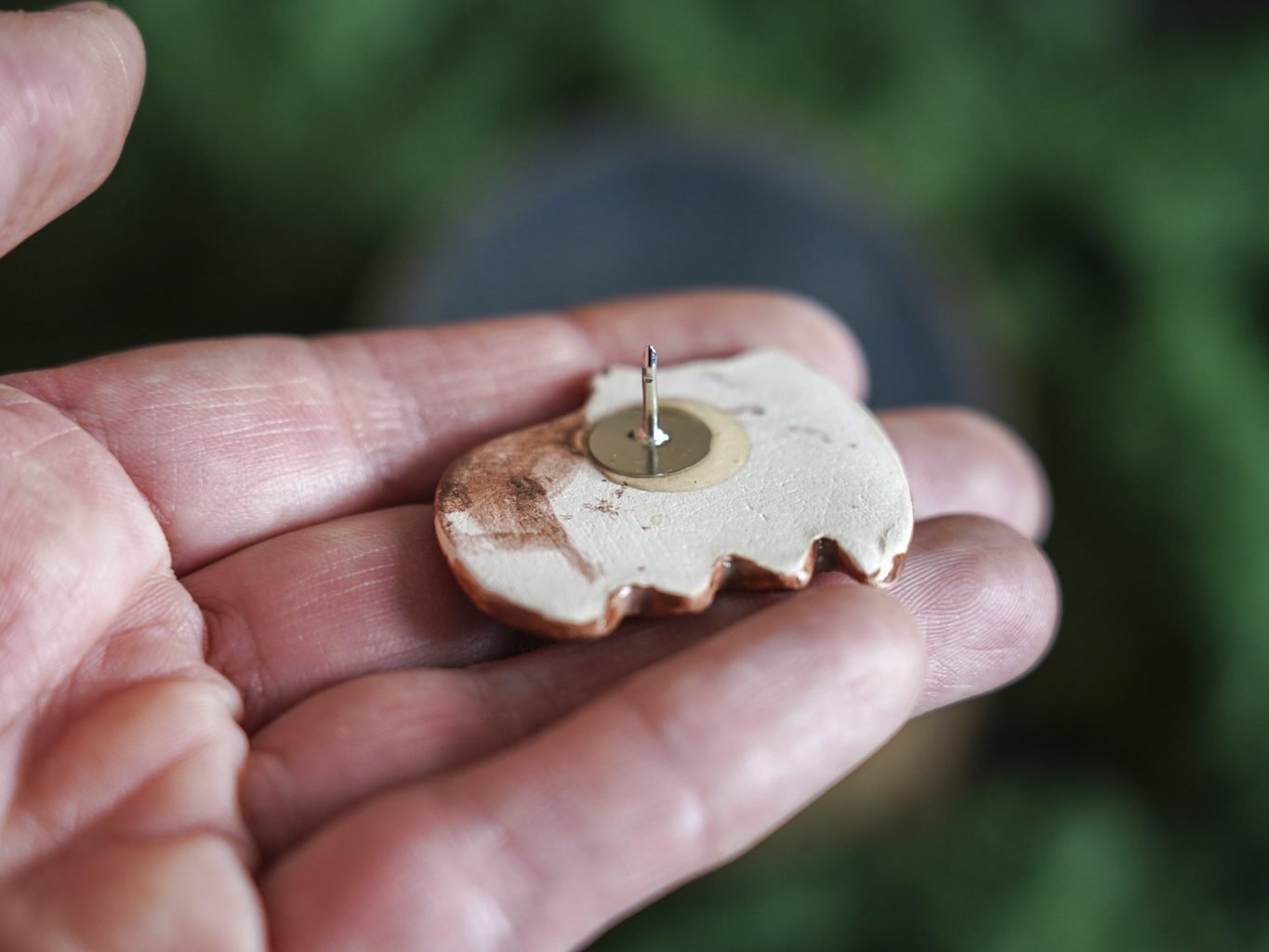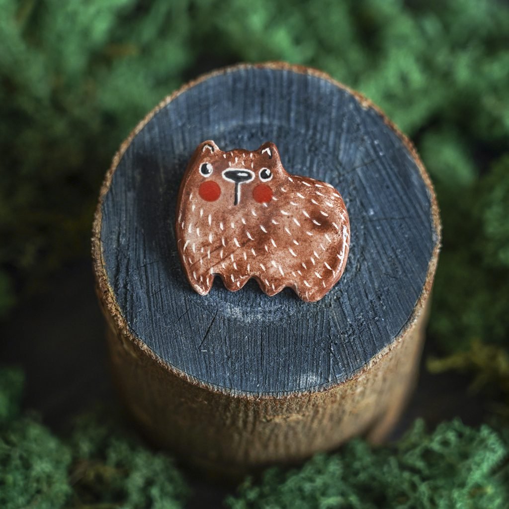 Papuošalai pagaminti iš keramikos. Iš molio nulipdytos formos išdegamos 1000 laipsnių temperatūroje, tada išpaišomos rankomis, padengiamos bespalve glazūra ir išdegamos antrąkart. Metalinė ženkliuko adatėlė pagaminta iš nerūdijančio plieno, kitoje pusėje užspaudžiama tvirta kietos gumos detale.