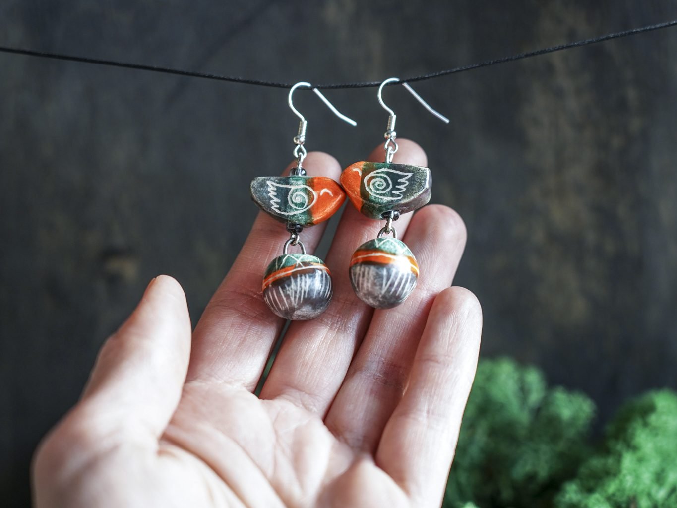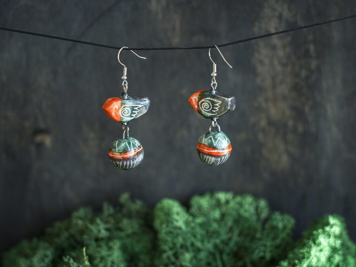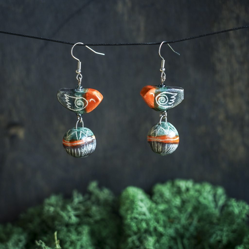 Papuošalai pagaminti iš keramikos. Iš molio nulipdytos formos išdegamos 1000 laipsnių temperatūroje, tada išpaišomos rankomis, padengiamos bespalve glazūra ir išdegamos antrąkart. Auskarų kabliukai pagaminti iš nerūdijančio plieno.