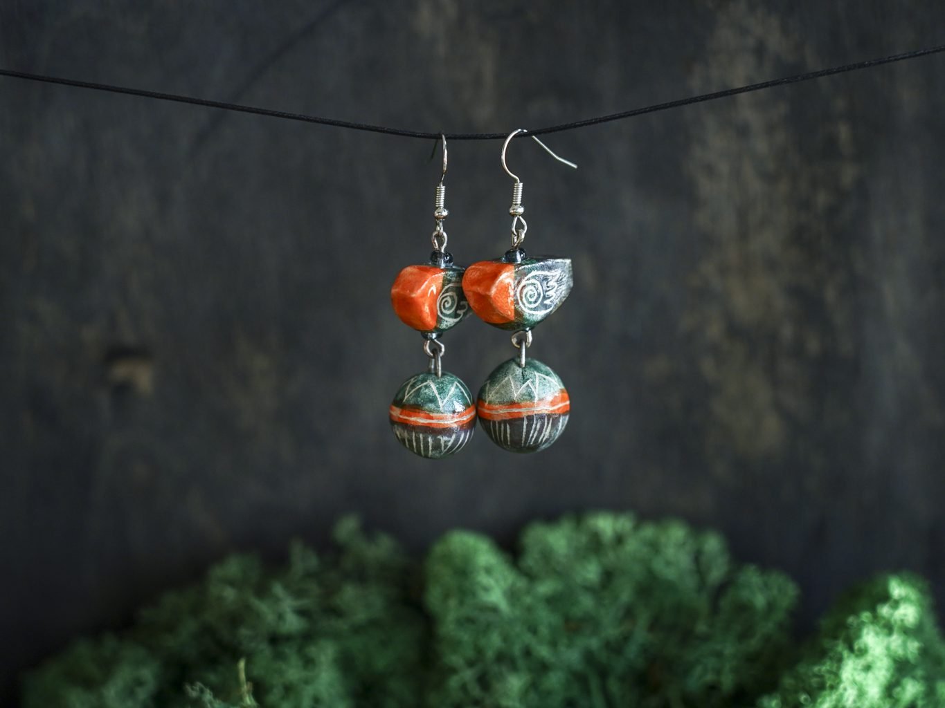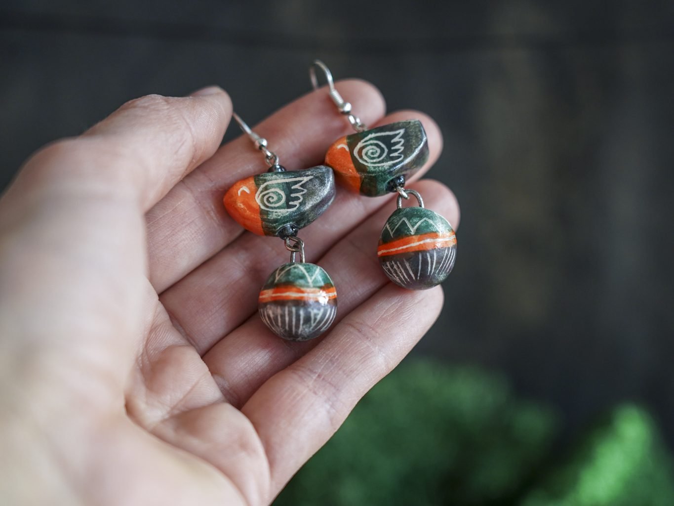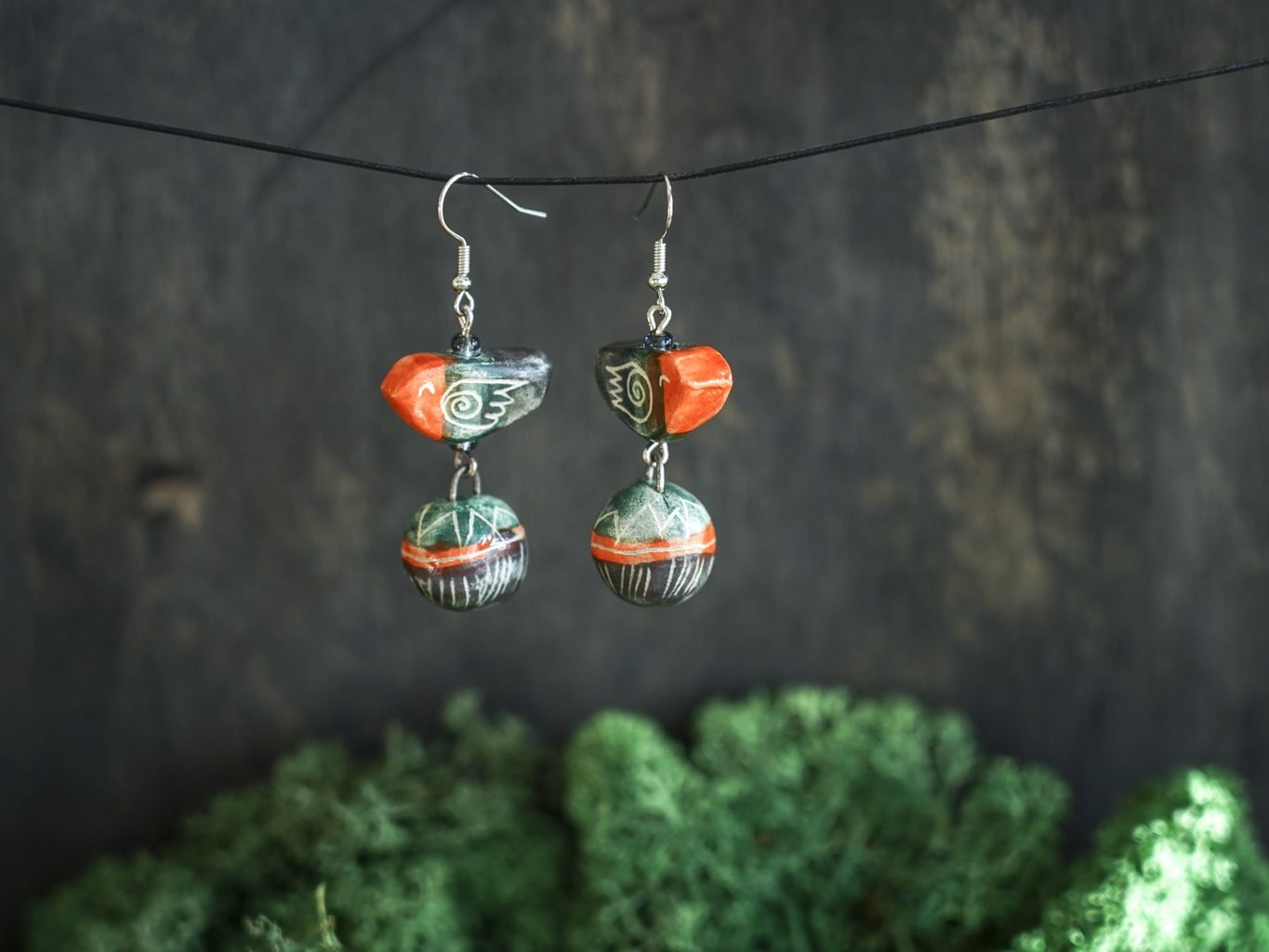Papuošalai pagaminti iš keramikos. Iš molio nulipdytos formos išdegamos 1000 laipsnių temperatūroje, tada išpaišomos rankomis, padengiamos bespalve glazūra ir išdegamos antrąkart. Auskarų kabliukai pagaminti iš nerūdijančio plieno.