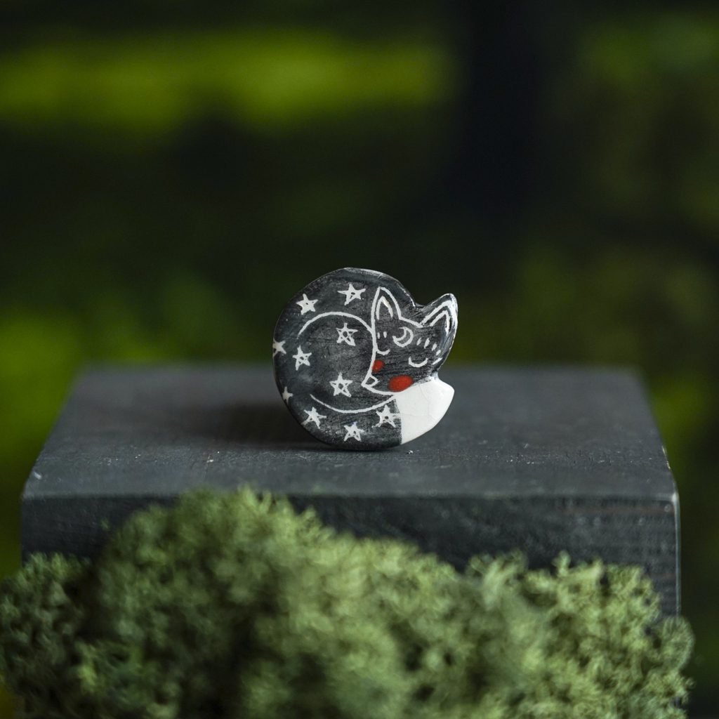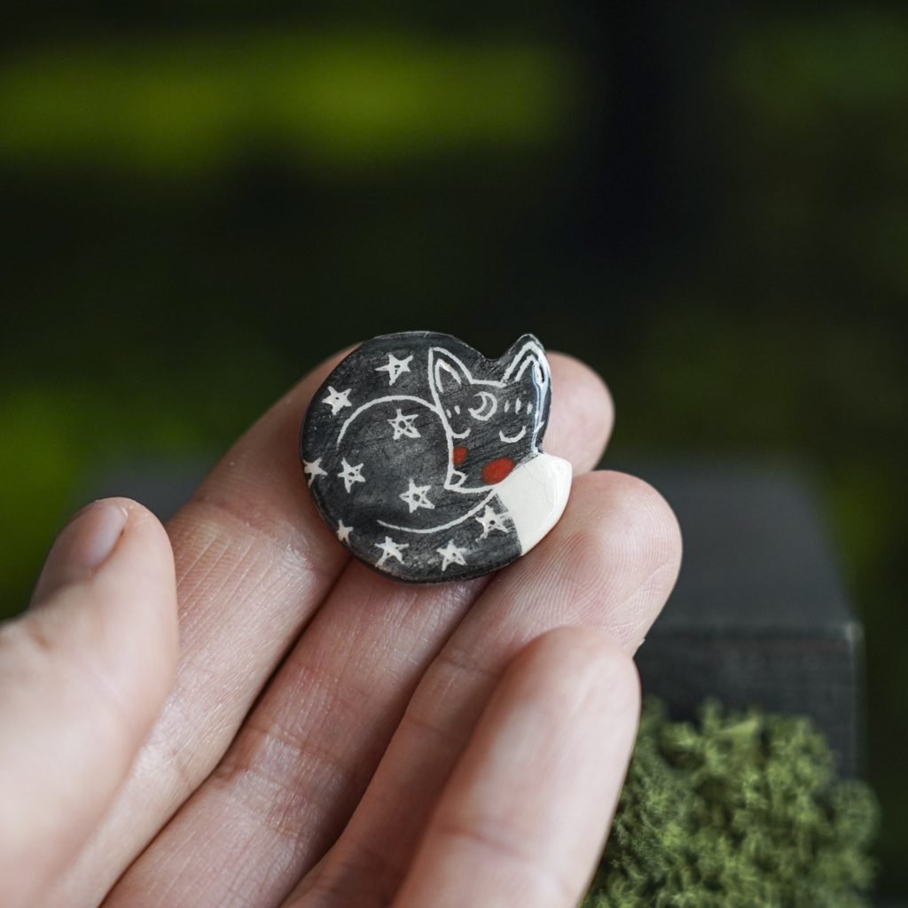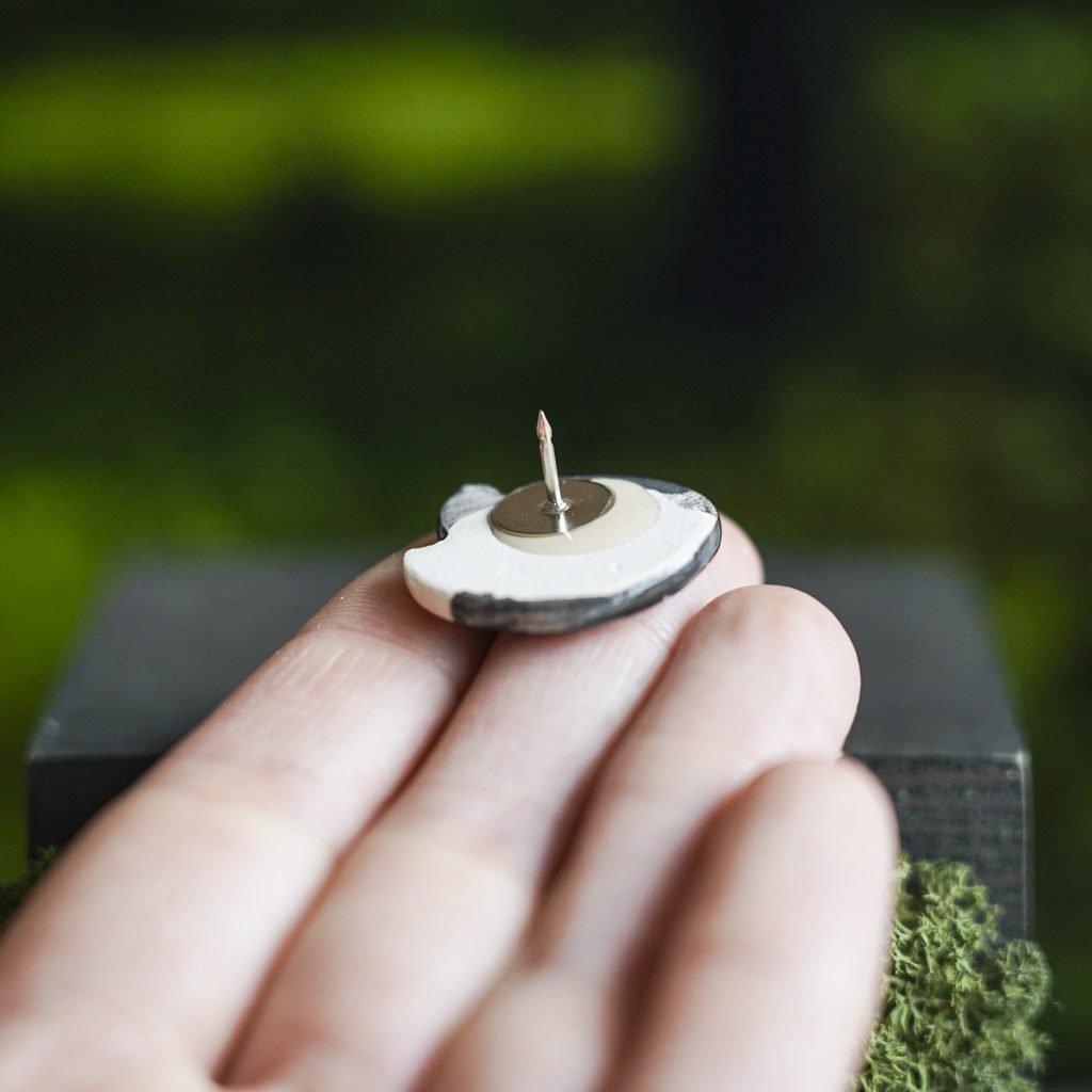 Papuošalai pagaminti iš keramikos. Iš balto molio nulipdytos formos išdegamos 1000 laipsnių temperatūroje, tada išpaišomos rankomis, padengiamos bespalve glazūra ir išdegamos antrąkart. Metalinė ženkliuko adatėlė pagaminta iš nerūdijančio plieno, kitoje pusėje užspaudžiama tvirta kietos gumos detale.