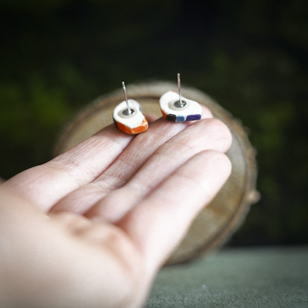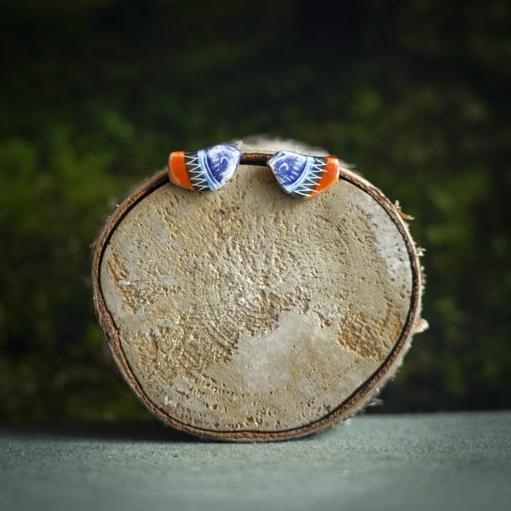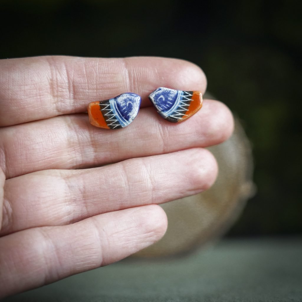 Papuošalai pagaminti iš keramikos. Iš balto molio nulipdytos formos išdegamos 1000 laipsnių temperatūroje, tada išpaišomos rankomis, padengiamos bespalve glazūra ir išdegamos antrąkart. Auskarų adatėlės pagamintos iš nerūdijančio plieno.