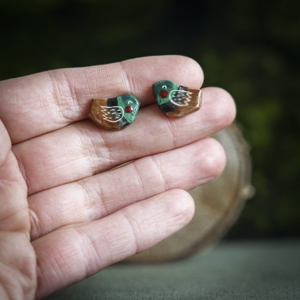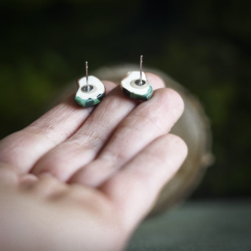 Papuošalai pagaminti iš keramikos. Iš balto molio nulipdytos formos išdegamos 1000 laipsnių temperatūroje, tada išpaišomos rankomis, padengiamos bespalve glazūra ir išdegamos antrąkart. Auskarų adatėlės pagamintos iš nerūdijančio plieno.
